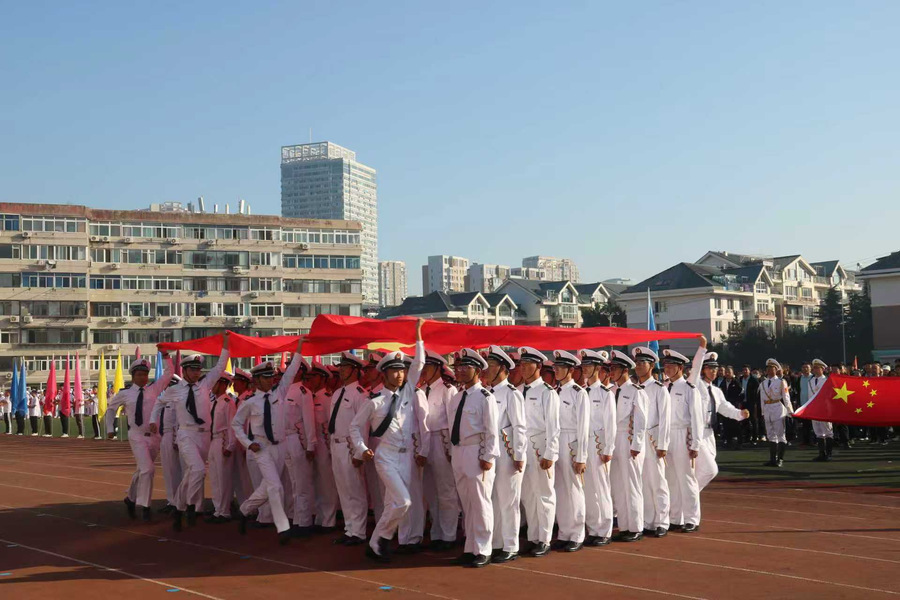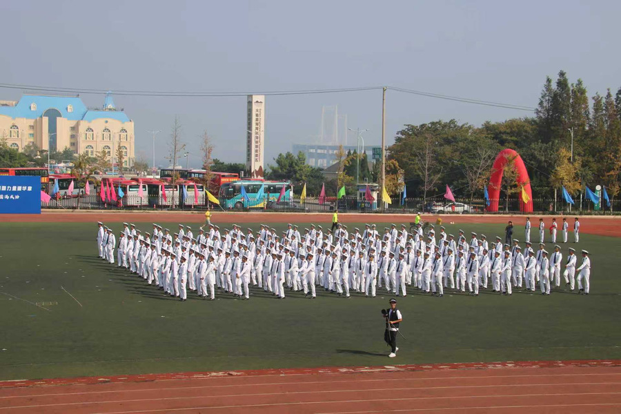 学院“海之魂”团体操展演方队更添亮色。学子们动作整齐划一、遒劲有力,尽显准军事化管理的严谨作风——这正是学院依托航海专业特色培养学子纪律意识的生动体现。“请党放心,强国有我”的口号响彻云霄,喊出了航船学子爱党爱国、挺膺担当的坚定信念;随后,“我爱DLOU”“信念坚定,风雨同舟,勇往直前,甘于奉献”的旗语展示次第展开,旗帜在空中划出优美弧线,既呼应了海洋与船舶的专业符号,更生动诠释了航船人扎根深蓝、服务国家的家国情怀。