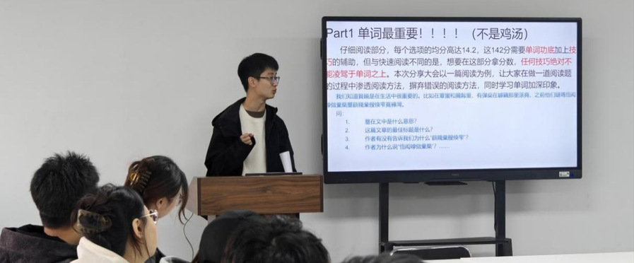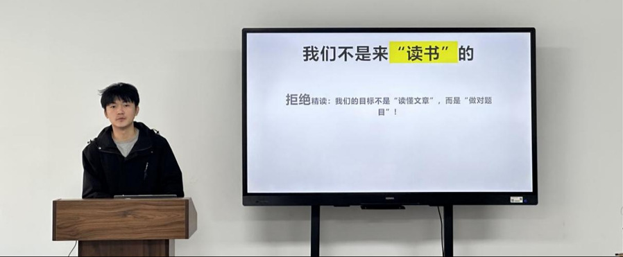 邱铭孔同学则聚焦快速阅读题型,分享了“高效扫读、精准匹配”的实用技巧。他强调,快速阅读的核心在于“不纠结细节,重逻辑与定位”,并通过分析真题文章结构特点,指导同学们如何快速划分文章段落层次。
